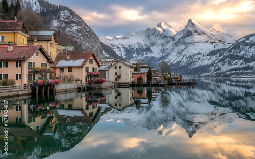© Graphic Habib, Fototapeta premium Idyllic Lakeside Village in Austria A Serene Reflection of Architecture and Nature Under a Winter Sky with Snow Capped Mountains in the Background Creating Tranquility