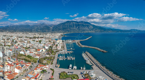 Obraz premium Idyllic landscape above Kalamata's Marina at sunset. Aerial photo of Kalamata city, Messenia, Peloponnese, Greece