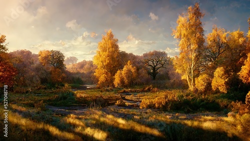 © OP38Studio, Fototapeta premium Idyllic landscape in autumn with forest and sun, 3d illustration.