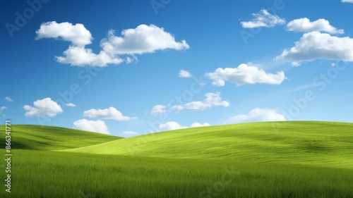 © Witch, Fototapeta premium Idyllic Landscape. Rolling Green Hills and Blue Sky with Fluffy White Clouds