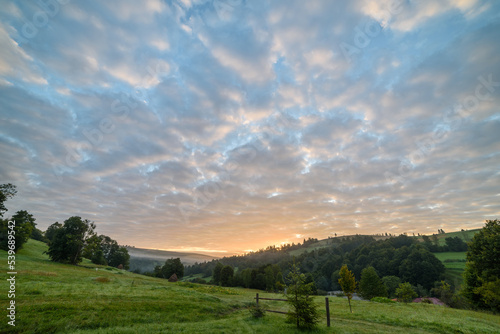 © Serhii, Obraz premium Idyllic landscape with green meadows and blooming flowers and mountain tops in background. Carpathians in Ukraine. Panorama with morning and evening fog. Mountains with forest at sunset or sunrise.
