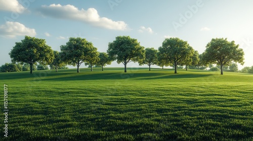 © RONNY, Fototapeta premium Idyllic landscape with trees on a grassy hill.