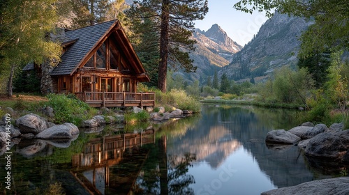 Fototapeta premium Idyllic log cabin sits on serene lake surrounded by trees, majestic mountains. Tranquil waters reflect charming home with wooden deck. Cabin perfect vacation rental for people love nature, peaceful