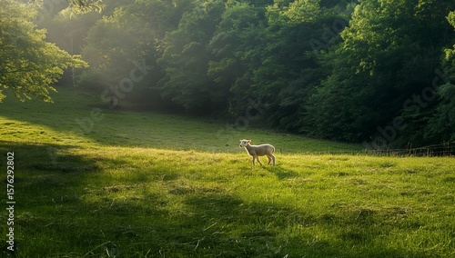 © filmanana, Naklejka premium Idyllic Morning Pasture with Lone Lamb in Sunlit Forest Meadow