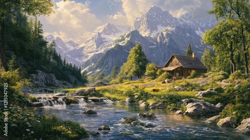 © Feli, Fototapeta premium Idyllic Mountain Cabin Scene with Flowing Stream, Majestic Peaks and Lush Greenery