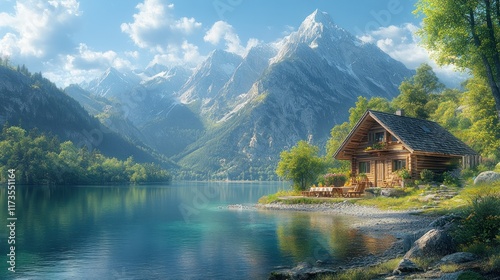 © Asgar, Fototapeta premium Idyllic mountain lake cabin.