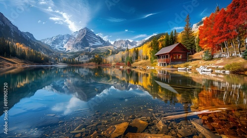 Fototapeta premium Idyllic Mountain Lake with Cabin and Autumn Colors