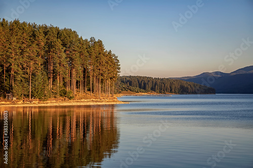 © EdVal, Fototapeta premium Idyllic mountain landscape at lake with calm water, tree reflection after sunset