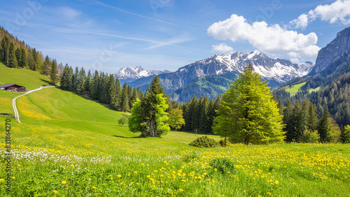 Obraz premium Idyllic mountain landscape in the Alps with blooming meadows in springtime