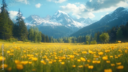 Obraz premium Idyllic mountain landscape in the Alps with blooming meadows in springtime : Generative AI