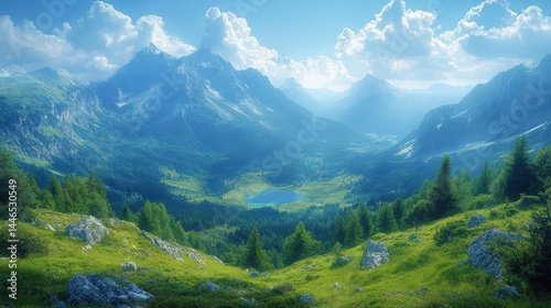 © Khaisan, Obraz premium Idyllic mountain landscape with green meadows, pristine lake, and blue sky