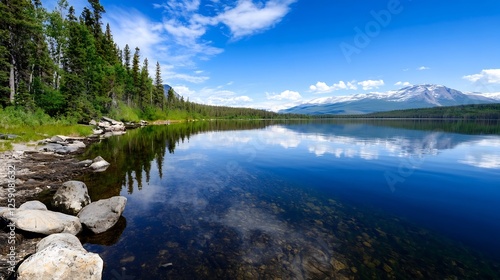© Generative AI, Fototapeta premium Idyllic Natural Lake Surrounded by Pine Trees and Mountains : Generative AI