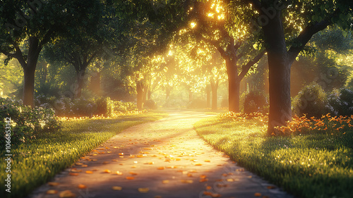 Naklejka premium Idyllic park scene featuring a sunlit path, inviting visitors to stroll...