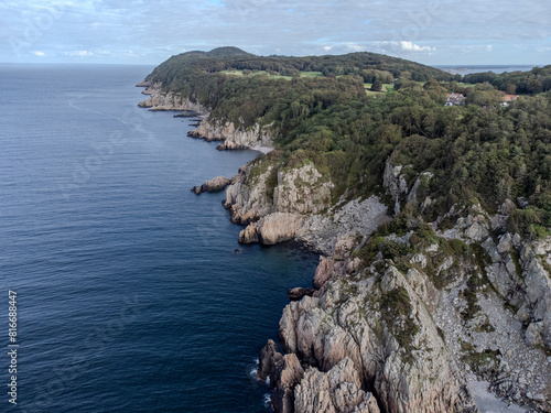 Fototapeta premium Idyllic remote coast is dotted with an abundance of lush evergreen trees in Varberg, Sweden