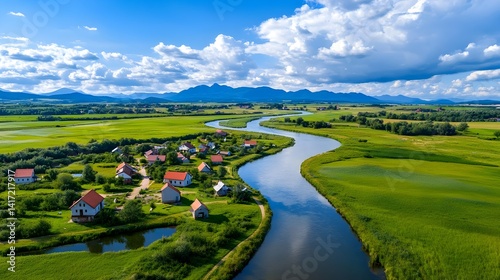 © terat, Obraz premium Idyllic River Village, Green Fields, Mountains - Aerial Views: Dro.
