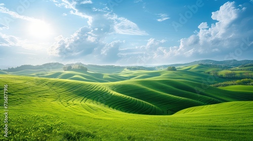 © sirisakboakaew, Fototapeta premium Idyllic Rolling Green Hills Under a Clear Blue Sky with Wispy Clouds.