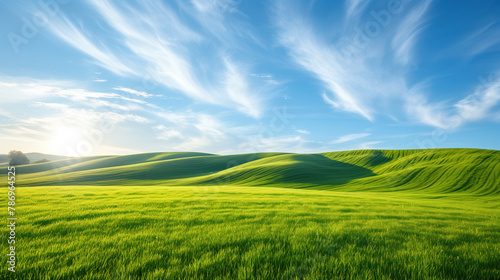 Fototapeta premium Idyllic rolling green hills under a vibrant sunrise with wispy clouds.