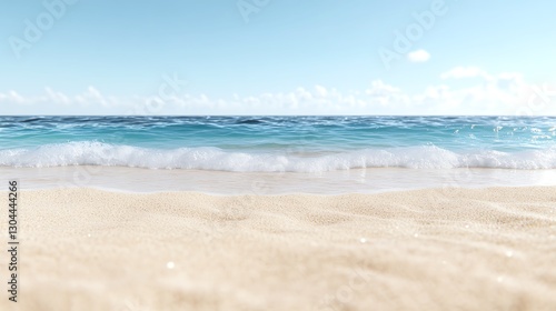 Obraz premium Idyllic sandy beach with gentle ocean waves under a clear blue sky, serene...