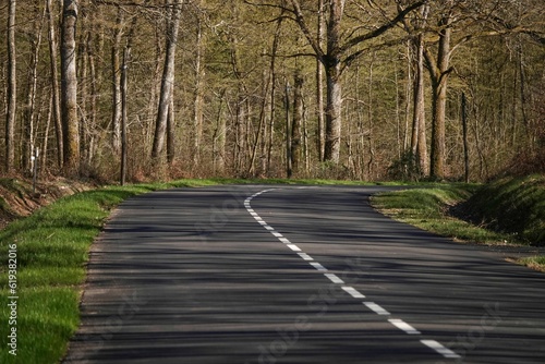 Fototapeta premium Idyllic scene of an asphalt road, lined with trees on either side, stretching...