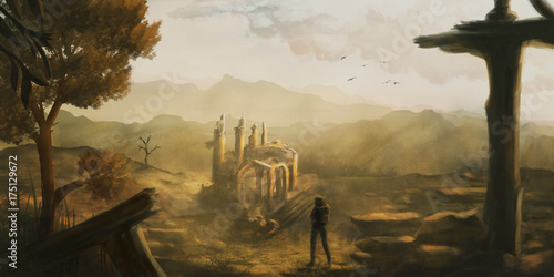 Naklejka premium Idyllic scenery where a person discovers old ruins, digital painting