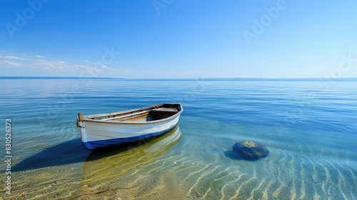 Naklejka premium Idyllic seascape with a small boat on calm waters under a clear blue sky,...