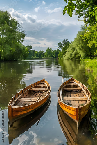© Travis, Fototapeta premium Idyllic Serenity: Punt Boats gently Floating on a Tranquil Lake Surrounded by Nature's Beauty
