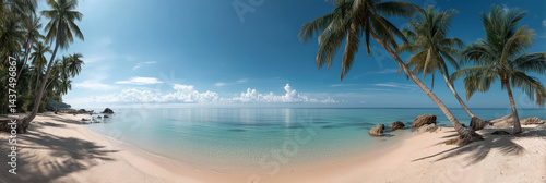 Fototapeta premium Idyllic tropical beach panorama with crystal clear water, white sand, and lush palm trees under a bright blue sky.