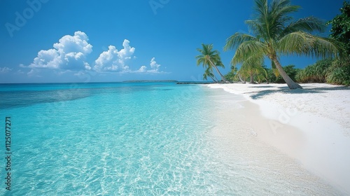 Naklejka premium Idyllic Tropical Beach Scene With Palm Trees And Clear Water