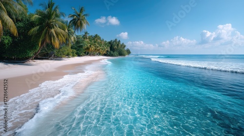 © Setu, Fototapeta premium Idyllic Tropical Beach with Palm Trees Azure Water and White Sand Under Bright Sky in Sunlight Perfect for Travel and Relaxation Photography