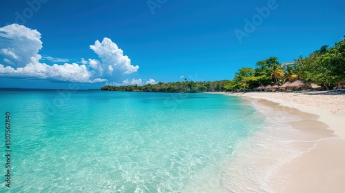 Fototapeta premium Idyllic tropical beach with turquoise water, white sand, and lush vegetation...