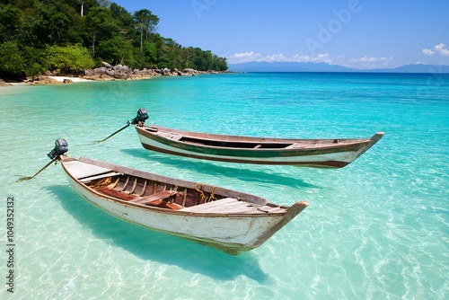 © Generative AI, Naklejka premium Idyllic Tropical Scene with Wooden Boats on Crystal Clear Waters : Generative AI