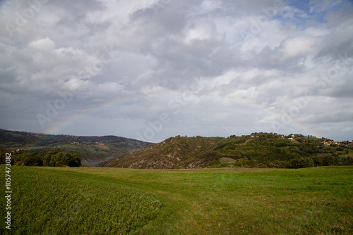 Obraz premium Idyllic valley view with rolling hills and a colorful rainbow, creating a...