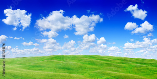 © Trutta, Fototapeta premium Idyllic view, green hills and blue sky with white clouds