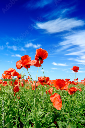 Obraz premium Idyllic view, meadow with red poppies blue sky in the background