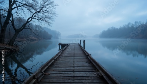 © AlIKY, Fototapeta premium Idyllic view of the wooden pier in the lake with mountain scenery background. Alps in the early morning.