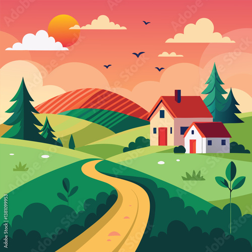 © Akas, Fototapeta premium Idyllic Village Scenery with a Cottage, Greenery, and a Tranquil Atmosphere