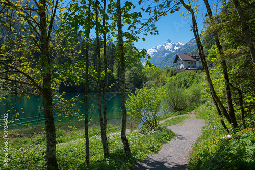 Obraz premium idyllic walkway from oberstdorf to lake Christlessee, allgau alps in spring.