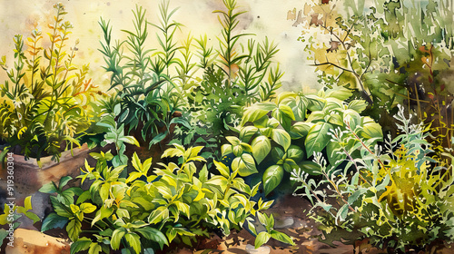 Fototapeta premium Idyllic watercolor of a herb garden, vibrant basil, rosemary, thyme, warm...