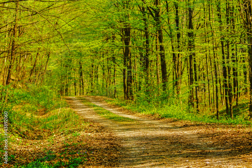 © czamfir, Obraz premium Idyllic way in green forest with soft sunlight shining through fresh green leaves at spring time.
