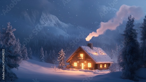 © Nurul wahidah, Fototapeta premium Idyllic winter scene: Warm cabin glows amidst snowy alpine wonderland