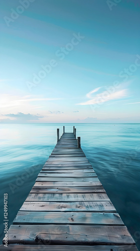© Brett, Fototapeta premium Idyllic Wooden Pier Extending Into Calm Sea Under Golden Sunset With Clear Sky and Gentle Waves