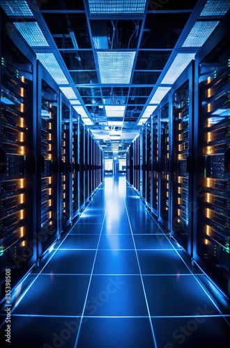 Fototapeta premium igh-tech data center with rows of server cabinets, illuminated by LED lights...