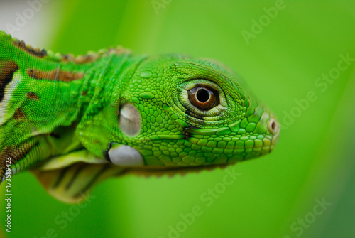 Fototapeta premium Iguana green in close-up with green background. South American and Brazilian...
