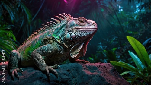 Fototapeta premium Iguana Illuminated by Neon Lights"