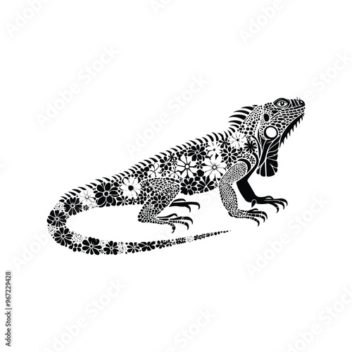 © Cici, Fototapeta premium Iguana reptile made by simple flower drawing, black and white animal illustration
