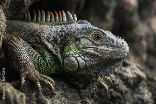 Fototapeta premium Iguana Resting on Rocky Surface Jungle Rock Texture
