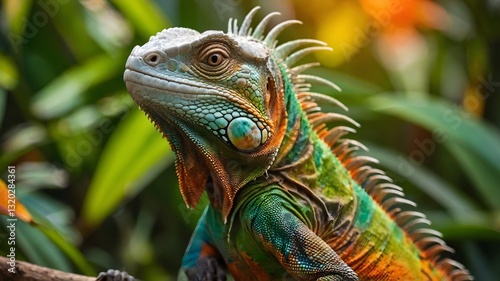 © KAThakshala, Obraz premium Iguana with Green and Orange Hues in Blooming Garden