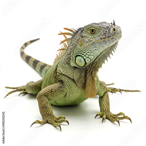 © Ari, Obraz premium Iguana with green skin placed on white background showing natural posture calmly