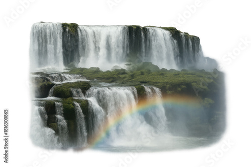 Naklejka premium Iguazu falls waterfall with rainbow over cascades and lush green vegetation showing natural beauty, transparent background