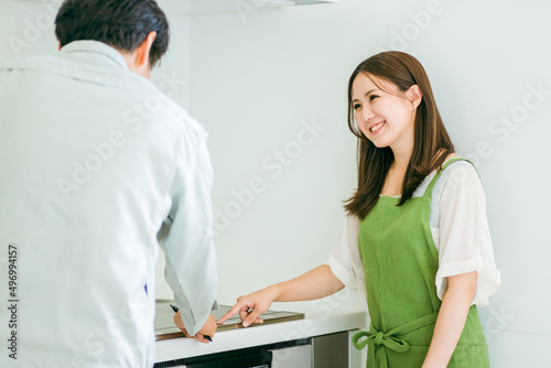 © buritora, Fototapeta premium キッチンで話す作業着姿の男性と女性(IH・笑顔)